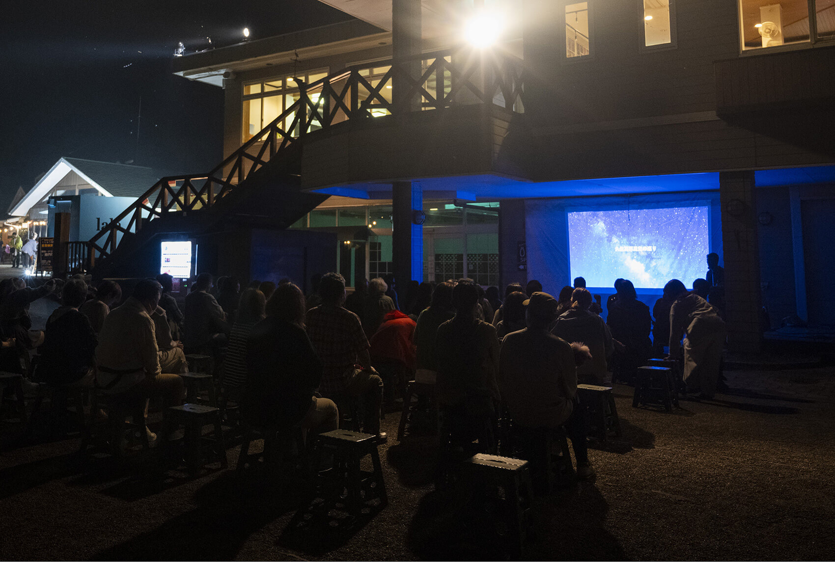 19時になると、いよいよお待ちかねのプログラムがスタート! まずはプロジェクターを使った「星のお話し」から。夜空に瞬く星たちの正体や、星座にまつわるギリシャ神話、宇宙のふしぎなどを、やさしく、そしてワクワクするように解説してくれます。まるで物語の世界へ入り込んだようなひとときに、大人も子どもも夢中に。常連の家族連れも多く、小さな子どもたちが目を輝かせながら星の話を聞く姿は、見ているだけで心があたたかくなります。