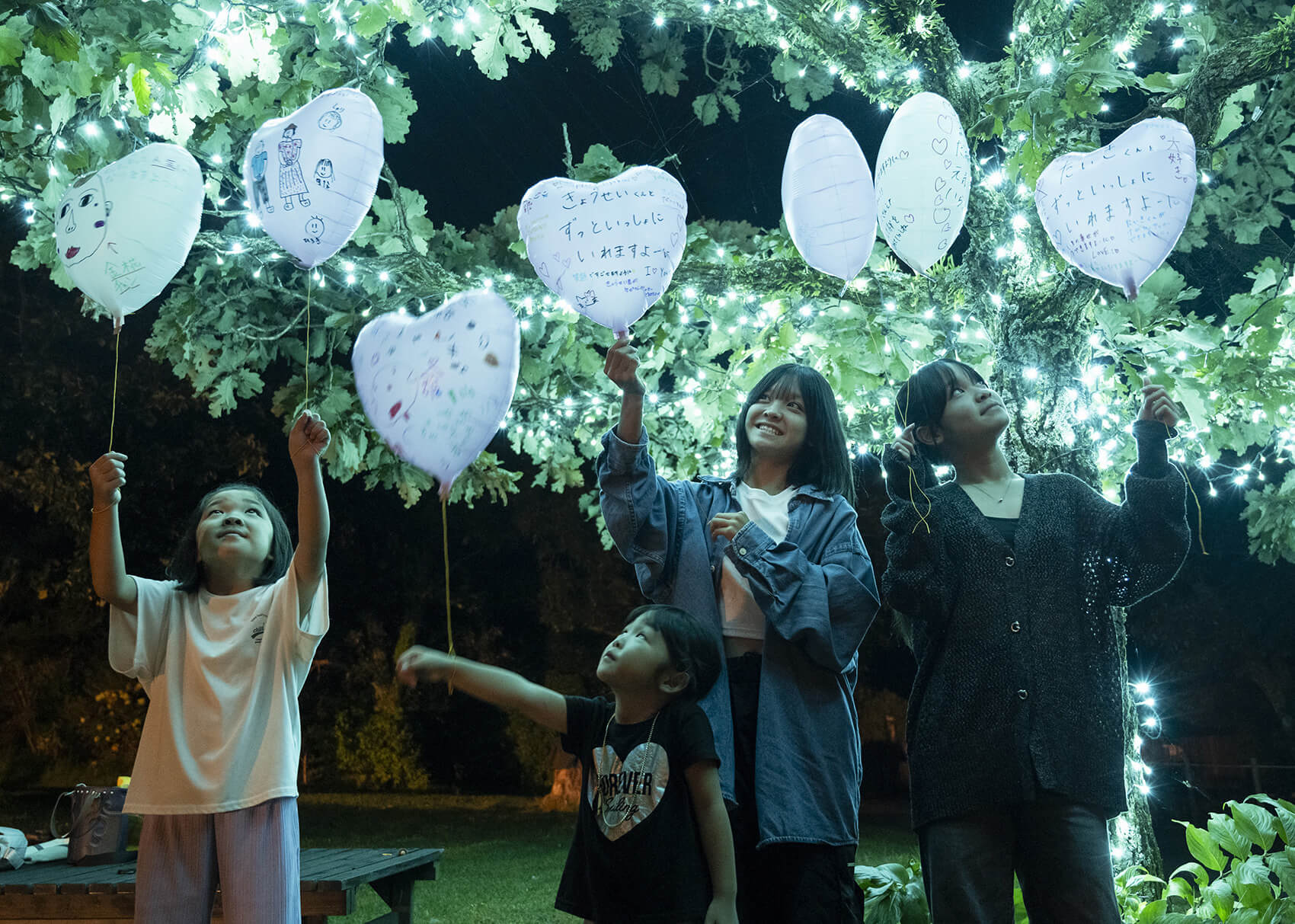 「星のお話し」が終わったあとは、みんなで願いを込めた“風船リリース”の時間。 それぞれが思い思いの願いを書いた色とりどりのエコ風船を手に、合図とともに一斉に夜空へ放ちます。
